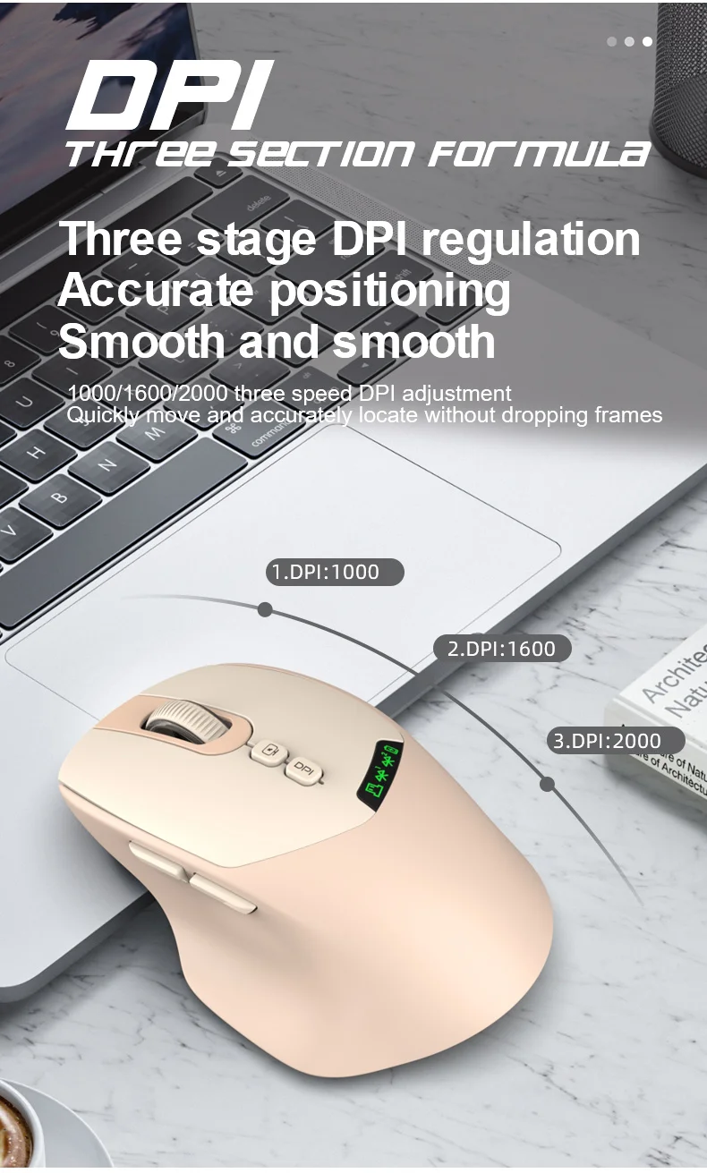 3. Three – stage DPI Adjustment: Three adjustable levels (1000/1600/2000) for precise positioning and smooth movement without frame drops.